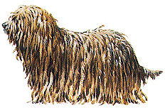 | Haar: | sehr reichlich, sehr lang und je nach Körperregion verschieden. Es ist von harscher Textur (Ziegenhaar), besonders auf der vorderen Körperhälfte. Von der halben Brust ab nach hinten und ist, je nach Alter des Hundes, bereits zottig; auf allen Gliedmassen tendiert es zur Zottenbildung oder ist bereits zottig, diese Zotten müssen oben auf der Rückenlinie ansetzen und über die Körperseiten herabfallen. Auf dem Kopf ist das Haar weniger rauh und es verdeckt die Augen. Auf den Gliedmassen muss das Haar überall gleichmässig verteilt sein und weiche Zotten bilden, die in Richtung Boden herabhängen. Das Haar bildet auf den vorderen Gliedmassen längliche, säulenförmige Zotten, auf den hinteren Gliedmassen flockenförmige Zotten ohne Fransenbildung. Die Unterwolle ist dermassen kurz und dicht, dass sie nicht leicht die Haut sehen lässt. Sie muss sich fett anfühlen. |
