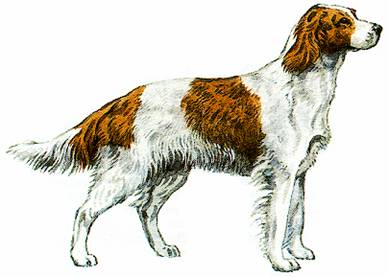 HAARKLEID HAAR : Langes seidiges Haar, als sogenannte "Befederung" an der Rückenseite der Vorder- und Hinterläufe, sowie auf der Außenseite des Behangs. Gleichfalls ist eine angemessene Menge Haar an den Flanken zu finden, welches sich an Brust und Hals fortsetzt und dort eine Art Besatz bildet. Die Befederung grundsätzlich gerade, glatt und ohne jegliche Lockenbildung sein, wobei eine geringe Wellenbildung zulässig ist. Die Rute sollte gut befedert sein. An allen anderen Körperpartien sollte das Haar kurz, glatt und ohne jegliche Lockenbildung sein. FARBE : Grundfarbe weiß, mit nicht durchbrochenen roten Flächen (wie gut abgegrenzte rote Inseln); wobei beide Farben ein Maximum von Intensität und Leuchtkraft auszeichnen sollte. Tüpfelung, jedoch keine Schimmelung (ROAN) am Gesicht, an den Pfoten, an den Vorderläufen bis höchstens zu den Ellenbogen und an den Hinterläufen bis höchstens zu den Sprunggelenken ist zulässig. Schimmelung (ROAN), Tüpfelung und Sprenkelung an jedem anderen Körperteil ist höchst unerwünscht und ist ein ausschließender Fehler.